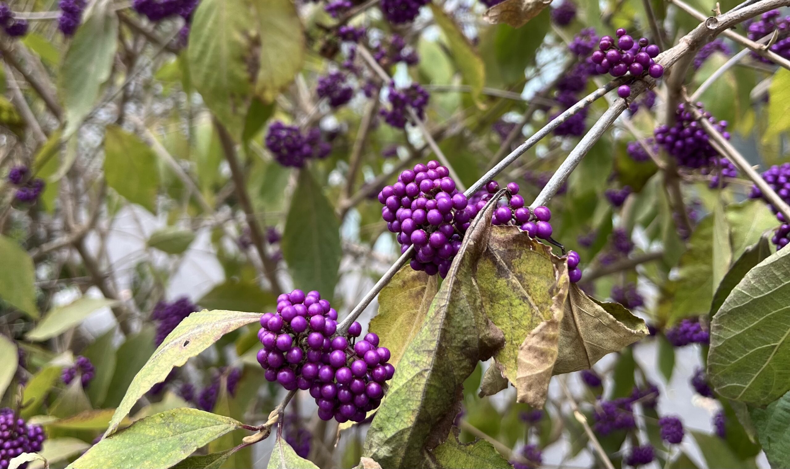 En me baladant après le déjeuner, mon oeil a été arrêté par une couleur inhabituelle. Pas vraiment belle, mais curieuse. Un arbuste présentait ses fruits en grappe, d’un violet rosé assez brillant. Un petit coup de Google Lens, et voilà l’énigme résolue : il s’agit d’un arbuste appelé « Arbre aux bonbons » ou mieux Callicarpa de son nom latin (qui vient du grec « Kalli » – beau – et « karpos » – fruit -), et qui signifie donc exactement ce pour quoi je l’ai remarqué. Etrange arbuste originaire de Chine, ou d’Asie, et très robuste.
